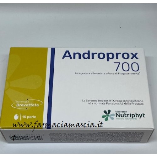 ANDROPROX 700 15 PERLE SOFTGEL è un integratore alimentare a base di numerosi estratti vegetali utile per favorire la corretta fisiologia delle vie urinarie e della prostata. Il prodotto presenta la seguente composizione: Serenoa frutto estratto lipidico-sterolico 90% Acidi grassi totali; Gelatina alimentare; Pygeum corteccia e.s. 2,5% Betasisteroli; Ortica radici e.s. 0,8% Betasitosterolo; Agente umidificante: Glicerolo vegetale; Pomodoro frulli e.s. 6% Licopene; Emulsionante: Lecitina di girasole; Stabilizzante: Cera d'api bianca; Zinco citrato; Acqua; Vitamina E; l-seleniornetionina: Coloranti: Titanio diossido, Ossido di ferro e complessi rameici della Clorofilla.