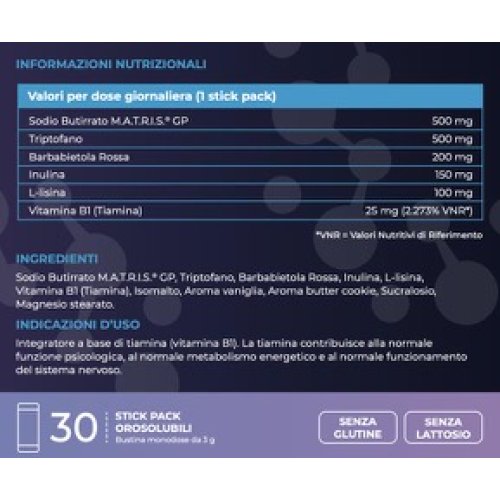 Sodio Butirrato M.A.T.R.I.S." GP, Triptofano, Barbabietola Rossa, Inulina, L-lisina, Vitamina B1 (Tiamina), Isomalto, Aroma vaniglia, Aroma butter cookie, Sucralosio, Magnesio stearato.